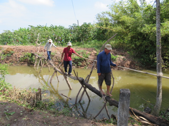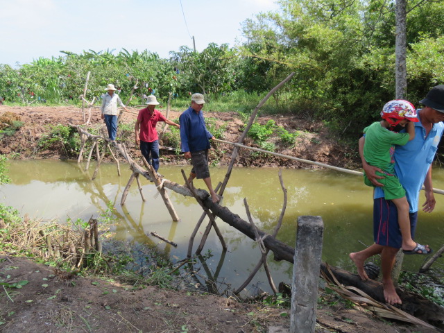 Cau Mieu Bridge is located in Xóm Chùa village also known as  Bồn Bồn, Thanh Phong commune, Thanh Phu district, Ben Tre province.  The  bridge is about 21m long, currently a monkey bridge, with only a dry tree trunk  crossing the river. Although it is unsafe, every day more than 100 people in  Xóm Chùa hamlet cross this bridge because it's very far to take a detour.   If rebuilt, it will be very convenient for the villagers, especially  those who need to carry stuff every day to work and also a big relief for  children who need to cross the bridge to go to school.   People here  have been asking the village to rebuild this bridge for many years, but they  have not been able to because there is no funding.