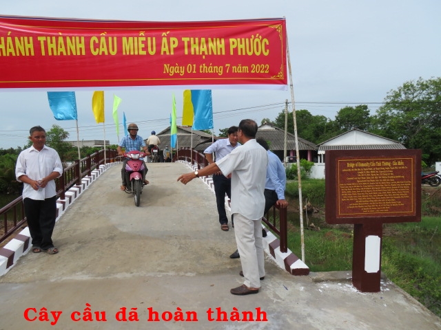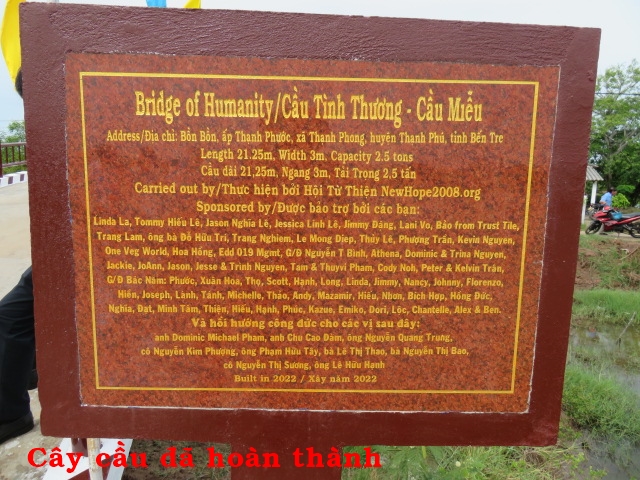 Xin chân thành cám ơn tất cả các bạn đã bảo trợ cây cầu Miễu này. Mong rằng một ngày nào đó khi các bạn có dịp đi ngang vùng quê hương này, sẽ thấy ấm lòng khi nhìn cây cầu do chính các bạn xây và nhìn lên bảng tên ân nhân thấy tên mình hay người thân trong đó sẽ cảm được một chút gì gắn bó với mảnh đất đã từng là quê hương của bạn hay của người thân.