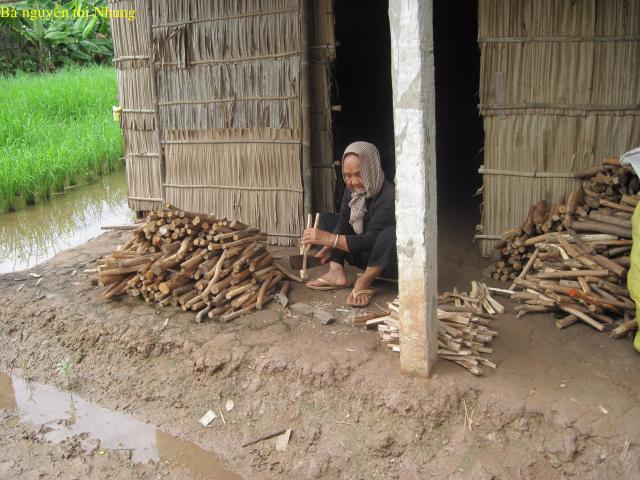 Mrs. Nguyen Thi Nhung, 75 years old. She has 1 child who lives far away and is very poor. She chops wood to sell at market daily with the help of a neighbor. Her husband is paralyzed.