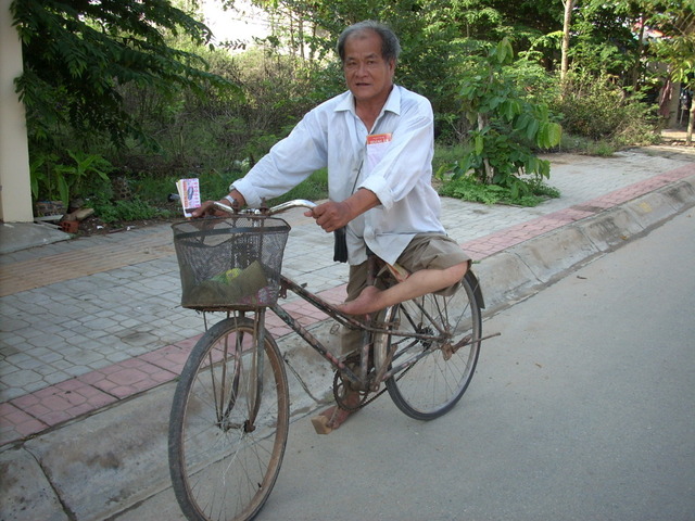 51. Mr. Nguyen Van Ba, age 62, disabled, selling lottery tickets for a living. His wife is Phung Thi Cuc, age 55. His disability happened when he got polio at the age of 5 and it makes it very difficult for him to move around. His wife got a slight form of mental disorder. Both of them earn their living by selling lottery tickets. Due to their poverty, they were given a charity house at 54A, Dinh Tho, Tuong Da, Chau Thanh, Ben Tre Province.