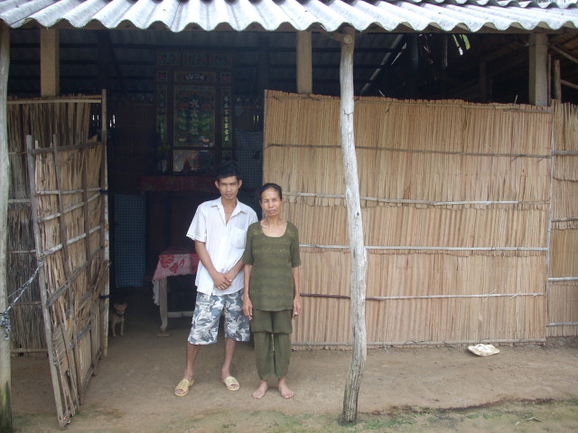 57. Mrs. Le Thi Tho, age 67, is living with her son, Ho Huu Phuc, age 31, who has mental trouble. Due to his illness, he cannot find a job and Mrs. Tho herself is too weak to work. They have no income and live at the mercy of the neighbors, eating on whatever given to them. Her other children are too poor to be of help to her.