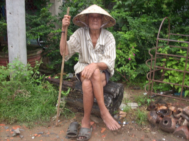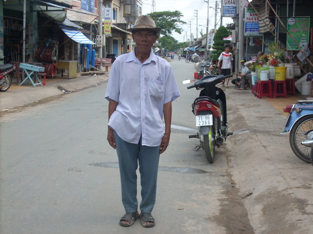 59. Mr. Huynh Van Vat, age 88, is residing near the Communal House of Thanh Phu town, near Hamlet 10, Thanh Phu, Ben Tre Province. With his wife getting old and feeble, his son in destitution, earning his bread somewhere away from home, he has no one to lean on for support. Everyday he would wander from one place to another, asking for charities and feed on whatever given to him.