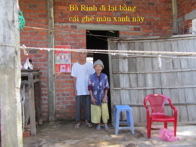 16. Mrs Le thi Rinh, 73 yrs old and her husband Mr Tran dinh Tu, 77 yrs old, they reside at 23/3 sup-hamlet Thanh tri Thuong, Thanh Phu, their children are very poor and found jobs far away can not be of any help, she now can not walk after an injury, she is getting around by scooting on a plastic chair, they rely on help of any charities and kindness of neighbors.