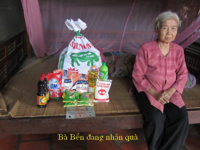 Bà Đặng Thị Bền, 70 tuổi. Số nhà 208/1 ấp Thạnh Quí A, xã Bình Thạnh, huyện Thạnh Phú. Bà sống một mình ở nhà. Hàng ngày bà bàu rau muống để bán được 15.000 đồng (1,5 đô). Bà bị bệnh đau thần kinh tọa nên làm được một chút là phải lên giường nằm nghỉ.