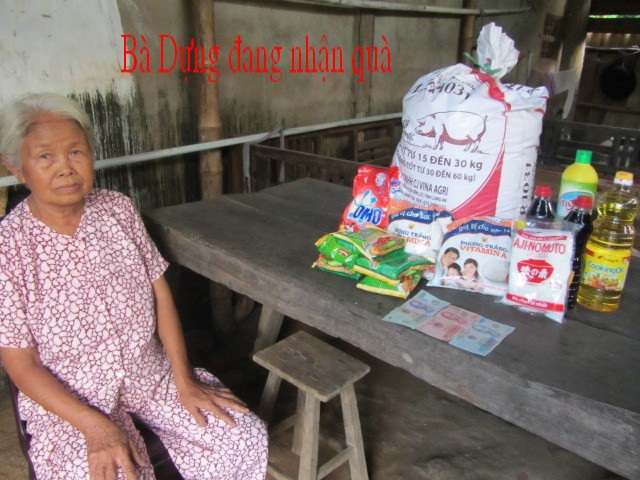 Bà Đặng Thị Dựng 72 tuổi, các con bà đều làm ăn xa nên bà chỉ ở có một mình tại số nhà 209/1, ấp Thạnh Quí A, xã Bình Thạnh, huyện Thạnh Phú. Bà bị gãy tay do tai nạn xe nên không còn khả năng làm việc. Bà sống bằng sự trợ giúp của những đồng tiền khiêm tốn của con bà.