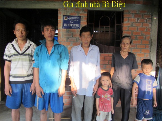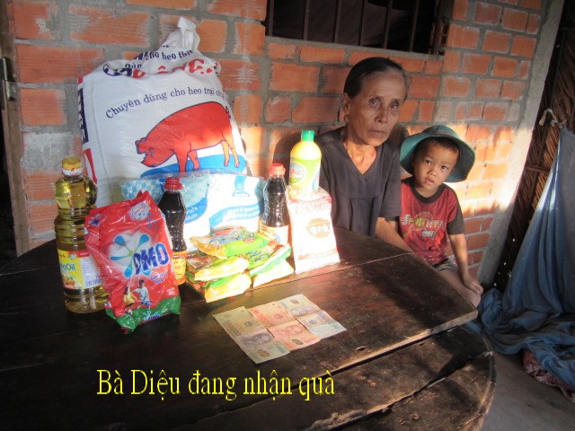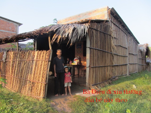 Bà Nguyễn Thị Diệu, 63 tuổi chồng bà Ông Bùi Văn Kia 58 tuổi không nghề nghiệp. Hàng ngày bà thường dẫn theo đứa cháu ngoại đi xin ở đầu đường xóa chợ để có tiền lo cho 6 miệng ăn là thật sự đau xót. Nhưng không còn cách nào khác vì nhà bà không ruộng đất cũng không nghề nghiệp và đều bị dốt. Bà được nhà nước xây tặng cho căn nhà tình thương.