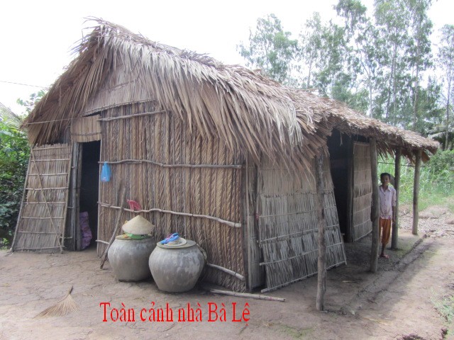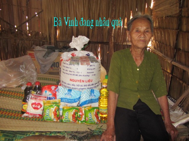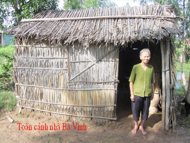 Bà Nguyễn Thị Vịnh, 77 tuổi, ở ấp Thạnh An, xã Bình Thạnh, huyện Thạnh Phú, tỉnh Bến Tre. Bà có người con trai có vợ con. Do người con dâu khó khăn không nuôi bà nên bà cất chòi ở tạm một mình. Nhà bà không có điện. Hàng ngày bà đi cắt lác và đánh dây lác mỗi ngày được 5.000 đồng (25 cents). Bà sống rất vất vả. Hàng tháng con bà chu cấp cho bà 100.000 đồng (5 đô). Với số tiền đó thì bà chỉ đủ ăn gạo thôi. Căn chòi của bà ngoài chiếc giường ngủ kê tạm bằng tre chả còn gì có giá trị.
