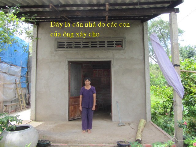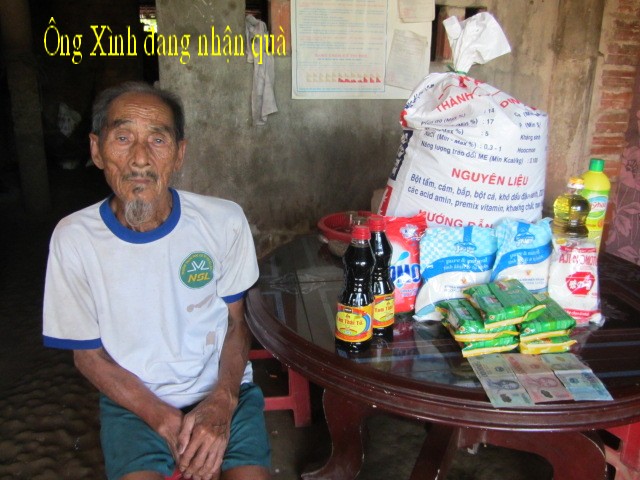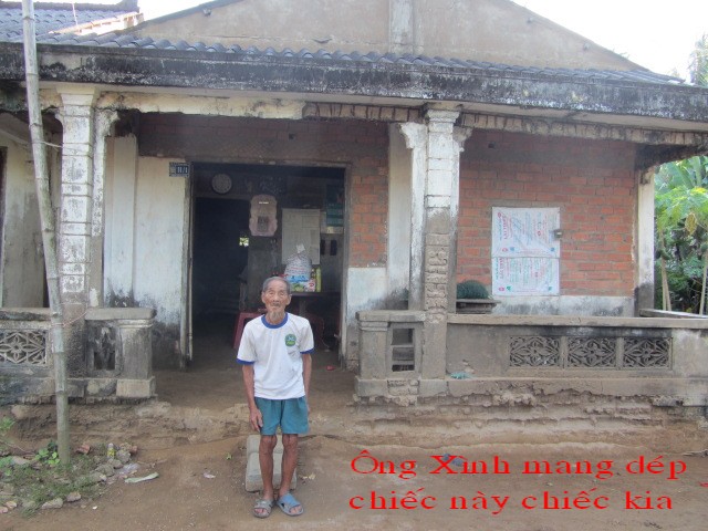Ông Võ Văn Xình, 89 tuổi. Ông ở với người con trai út làm nghề phụ hồ mỗi ngày được 100.000 đồng mà phải lo cho 5 miệng ăn và 2 con ông đều con nhỏ trong độ tuổi đi học nên cuộc sống gặp rất khó khăn. Ông Xình mang đôi dép cũng chẳng được lành lặn. Ông Xình do lớn tuổi nên thường hay bệnh cao huyết áp.