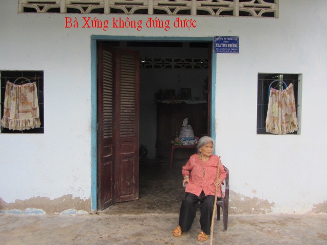24. Mrs. Ngo Thi Xung, age 89, is residing at 206/2 Thanh Tri Ha Hamlet, Thanh Phu. Both of her children passed away and she is now living with her grandchild on the Old Age Support of 6,000 VND (USD 30c.) a day, which makes their living in great difficulty let alone the fact that she can hardly move around due to her arthritis problem.
