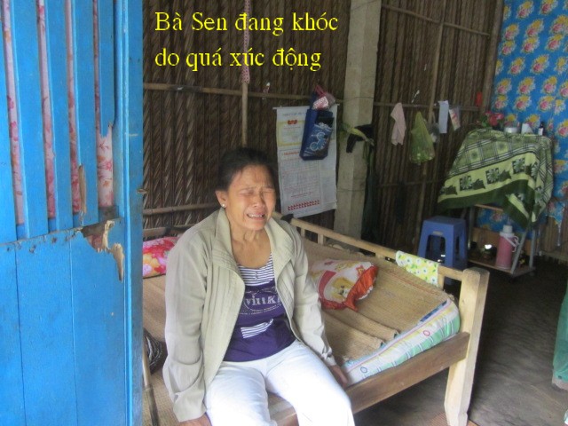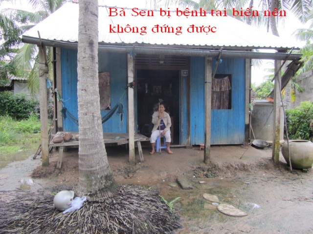 Bà Nguyễn Thị Sen, 63 tuổi. Số nhà 185/1 ấp Thạnh Hòa, thị trấn Thạnh Phú. Thôi chồng và sống với đứa con gái duy nhất đang học lớp 9. Bà bị bệnh tai biến vừa xuất viện về nhà. Thu nhập chính của bà là nhờ vào 6 cây dừa xung quanh nhà. Với thu nhập khiêm tốn lại gặp dừa đang mất giá thảm hại nên cuộc sống bà vô cùng khó khăn. Bà sống nhờ vào sự giúp đỡ của bà con chòm xóm.