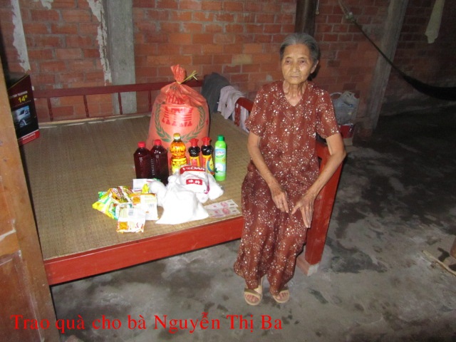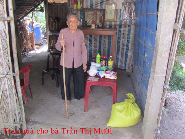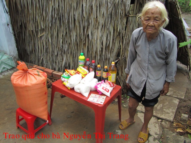 Bà Nguyễn Thị Trang 86t ở ấp 7 xã Thạnh Phú huyện Thạnh Phú. Có con nhưng rất nghèo và ở riêng, bà sống một mình trong căn nhà chưa đầy 8 met vuông. Hang ngày bà đi xin ăn ở ngoài chợ Giồng Miểu khi có ăn khi không.