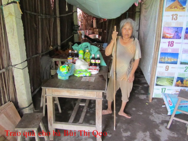 Bà Bùi Thị Qẹo 63 tuỗi : Ở Cồn Điệp, xã Thạnh Phong, huyện Thạnh Phú bị tật 02 chân hằng ngày đi hái đậu phụng nhổ cổ thuê để kiếm tiền về mua gạo đang ở đậu nhà người quen.