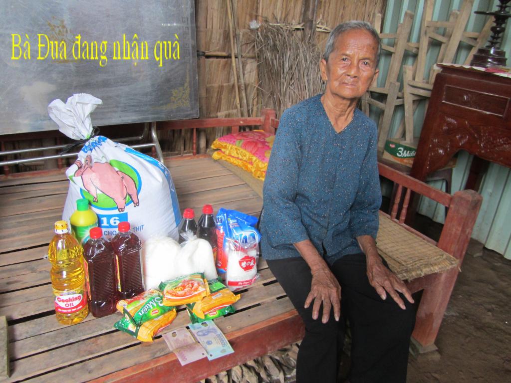 Bà Nguyễn Thị Đua, 89 tuổi. Số nhà 12/2, ấp Thạnh Lợi, xã Bình Thạnh, huyện Thạnh Phú. Bà sống có một mình, hàng ngày ai cho gì ăn nấy và đi xin ngoài chợ nên rất vất vả.