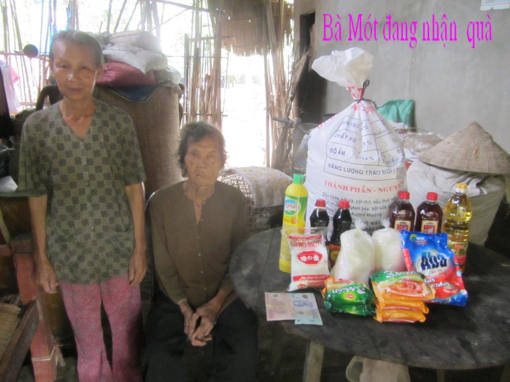 Bà Nguyễn Thị Mót, 87 tuổi. Số nhà 60/5, ấp Thạnh Hòa B, Thị trấn Thạnh Phú, huyện Thạnh Phú, tỉnh Bến Tre. Bà sống với người con gái tên Nguyễn Thị Cải, 59 tuổi không nghề nghiệp, Hàng ngày hai mẹ con đi hái rau dọc đường để bán kiếm tiền nhiều nhất chỉ được 20.000 đồng (1 đô) nên không đủ ăn hàng ngày.