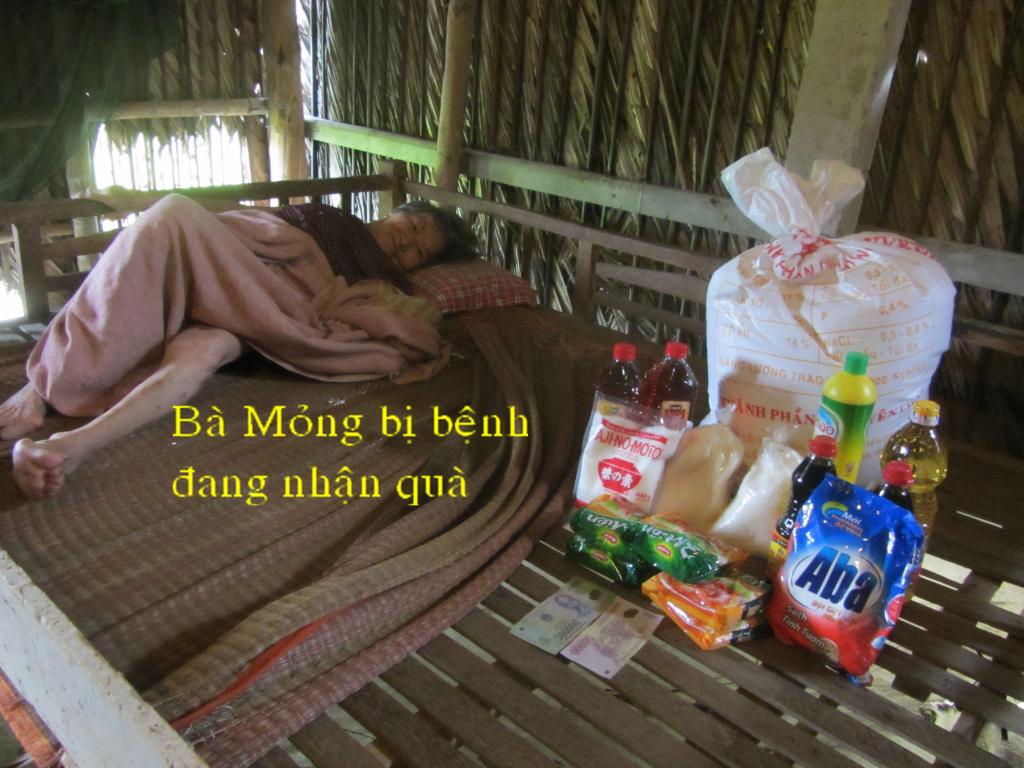 Bà Tôn Thị Mỏng, 86 tuổi. Số nhà 18/2 ấp Thạnh Quí B, xã Bình Thạnh, huyện Thạnh Phú. Bà bị bệnh tai biến chỉ nằm một chỗ và mọi sinh hoạt của bà là do người con dâu chăm sóc, nên rất khó khăn vất vả.