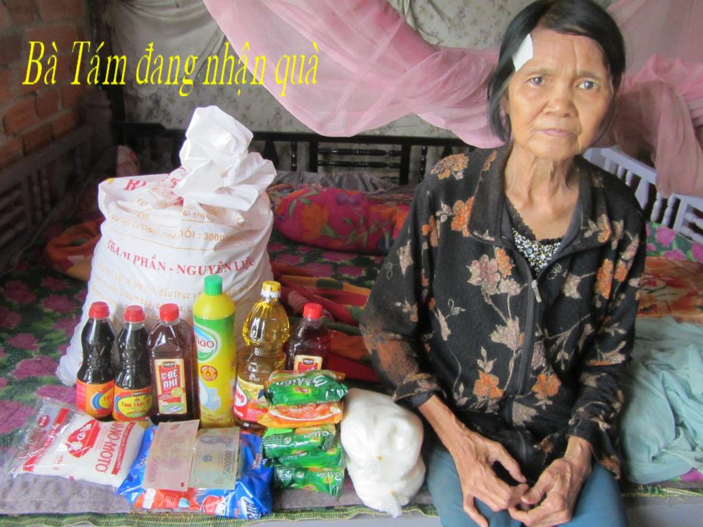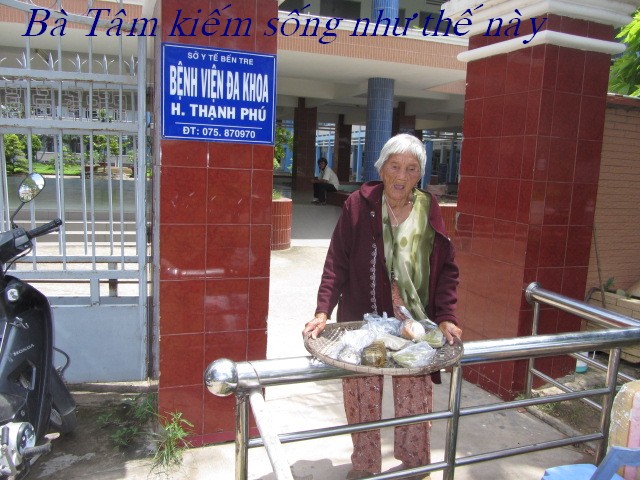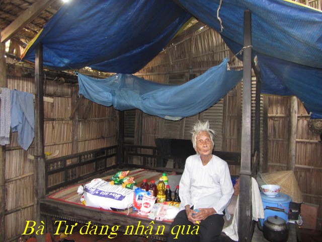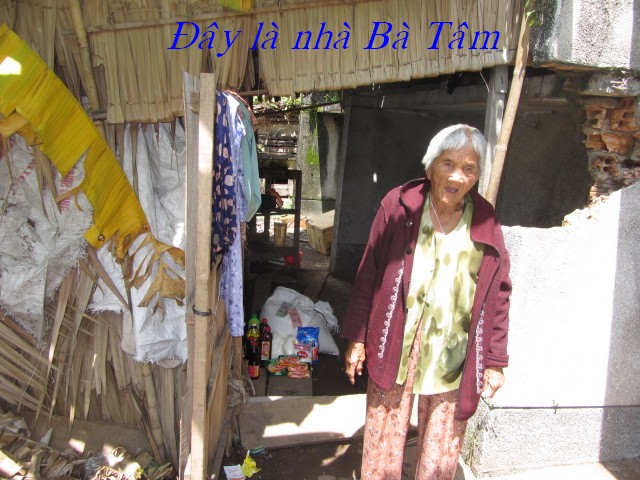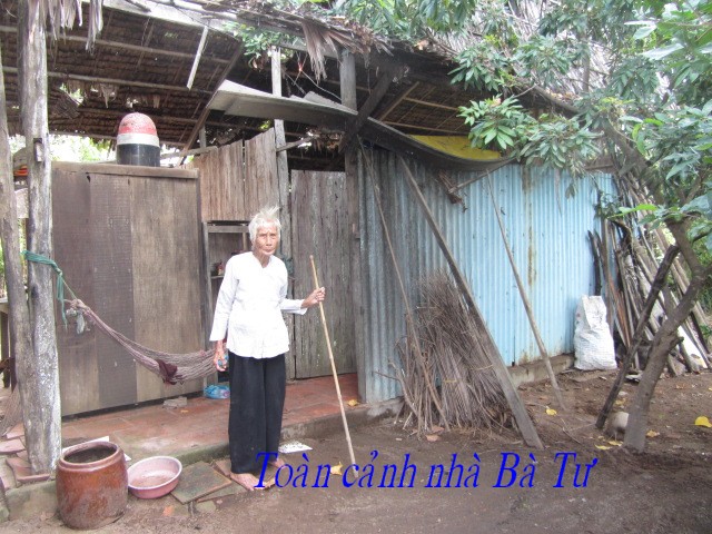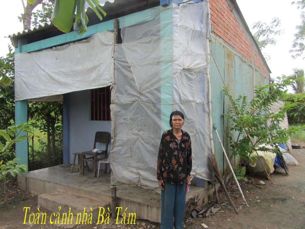 Bà Trịnh Thị Tám, 66 tuổi. Số nhà 225/1, ấp Thạnh Hòa A, Thị trấn thạnh Phú, huyện Thạnh Phú. Bà sống bằng nghề lượm ve chai mỗi ngày được 20.000 đồng (1 đô) nên không đủ sống.