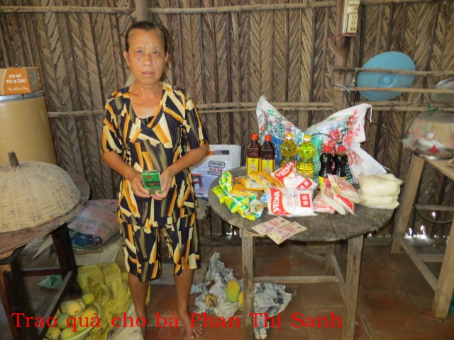 Bà Phan Thị Sanh 63t ở Cồn Chim xã Thạnh Phong huyện Thạnh Phú tỉnh Bến Tre. Không chồng con, ruộng đất. Hàng ngày bà vá lưới chài thuê để kiếm sống.