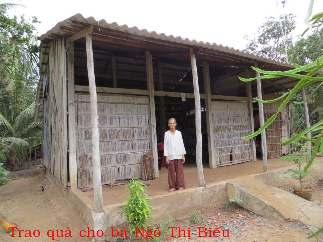 Bà Ngô Thị Biếu 75t ở ấp Quí Lợi xã Hòa Lợi huyện Thạnh Phú tỉnh Bến Tre. Chồng chết, con nghèo đi làm thuê ở xa không nhà. Hàng ngày ở nhà bà có hơn 1 công đất lá dừa nước bán để kiếm sống.