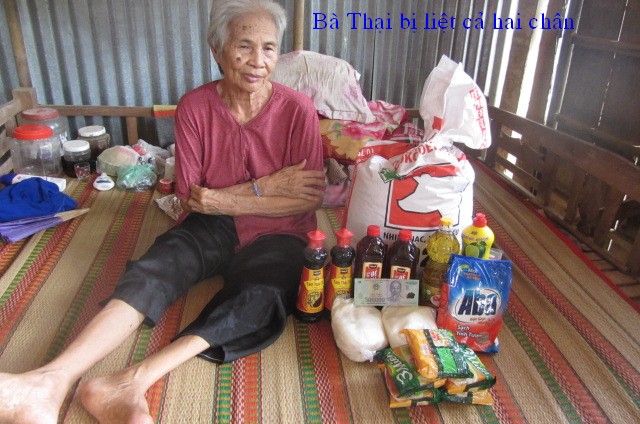 Bà Nguyễn Thị Thại, 75 tuổi. Số nhà 7/2, ấp Thạnh An, xã Bình Thạnh, huyện Thạnh Phú, tỉnh Bến Tre Bà bị bệnh liệt cả hai chân.