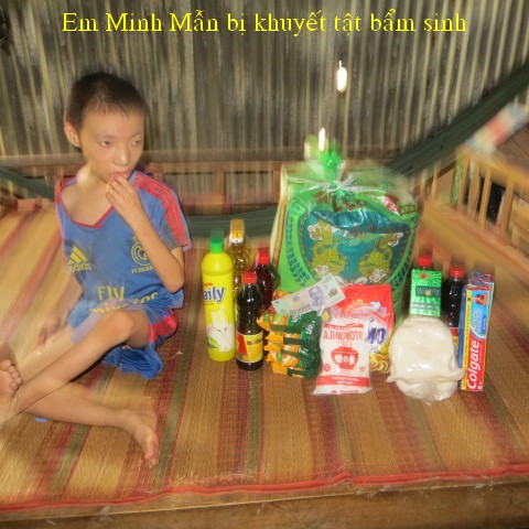 Nguyen Minh Man, born in 2006, resides at 3/3, Qui Thuan B hamlet, Hoa Loi village, Thanh Phu district, Ben Tre providence. He is disabled since birth with no self-reliance. He lives with his parents and grandmother, 60 years old. Everyday, his parents work whatever job is available. Their family has hardship and belongs to the poor group.