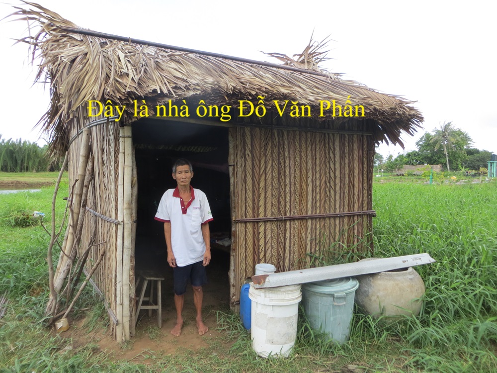 Mr. Đỗ Văn Phấn, 65 years old. He suffers from liver disease caused by excessive drinking in his youth. He is homeless. Local residents arranged for him to have a small piece of land and helped build a temporary hut for him. He lives alone, without electricity or water, in An Ninh Hamlet, An Qui Commune, Thạnh Phú District, now An Qui Commune, Vĩnh Long Province.