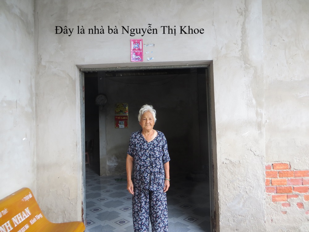 Mrs. Nguyễn Thị Khoe, 85 years old. She lives with her daughter at 4/3, Thạnh Quí Hamlet, Thạnh Phú Town, now Thạnh Phú Commune, Vĩnh Long Province.