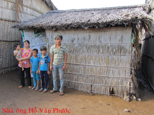 Ông Hồ Văn Phước 35t chưa có số nhà, ở Vôi Đước xã Thạnh Hải huyện Thạnh Phú, có vợ và 3 con, đứa con lớn nay 13 tuổi, đứa nhỏ nay 2 tuổi. Nhà không ruộng đất, hàng này đi vác đất đắp vuông thuê và ai thuê gì thì làm nấy. Căn nhà đang ở đậu, lúc nước lớn, nhà đều bị ngập lên khoảng 20 cm. Hiện nay chủ đang đòi nhà lại, người hàng xóm có cho một nền để xây nhà lại nhưng không có tiền để cất.