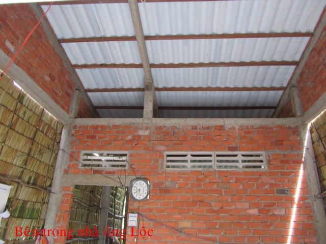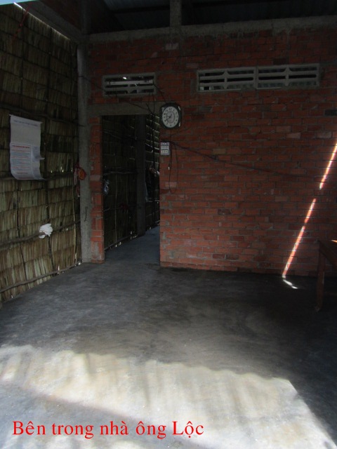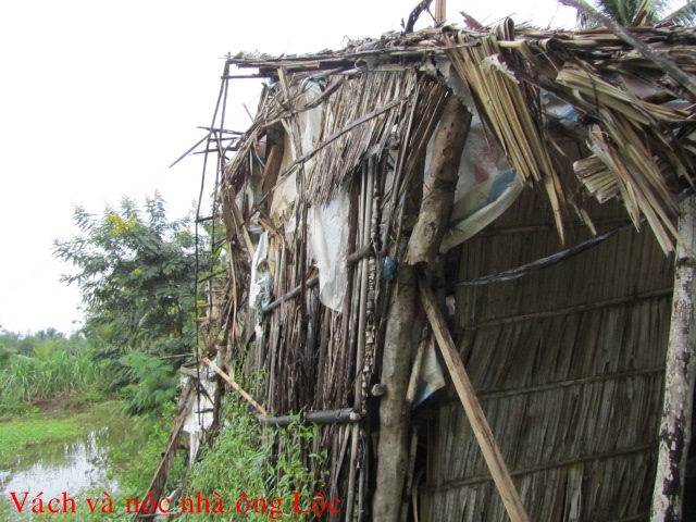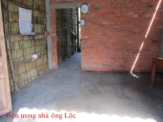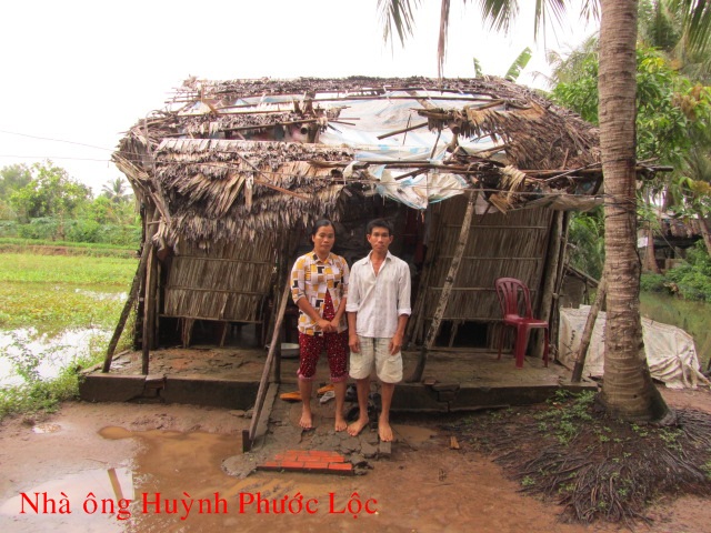 Mr. Loc Phuoc Huynh, 37 years old, currently resides at village #5 in Thanh Phu district. There are 3 members in his household: himself, his wife, and a child 11 years old, currently in elementary school. He makes a living by mixing cement, and earns about 2 dollars a day. His wife works as laborer for hire, doing any job that is available, mostly picking weeds. Mr. Huynh and his wife have been living in this house since they got married. It has been 16 years. The house has been fixed as needed based on their ability. Up to now, it looks like it can collapse anytime.
