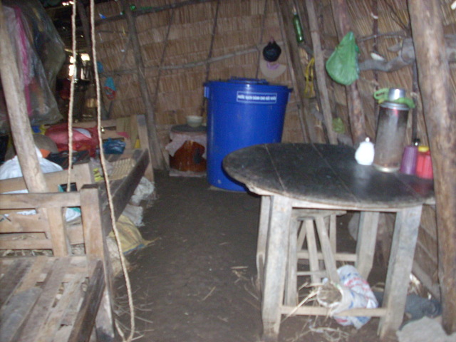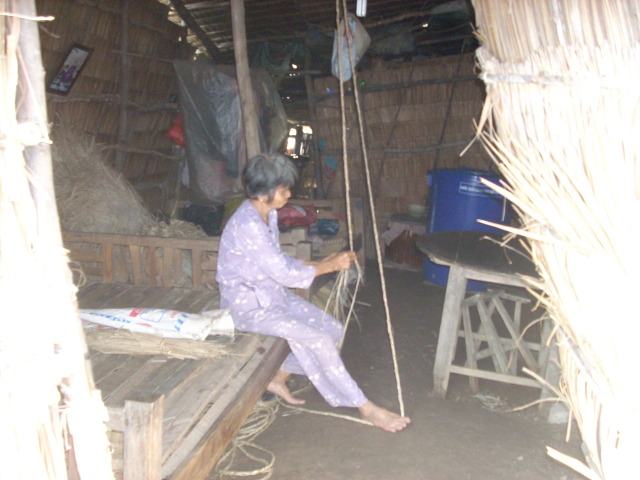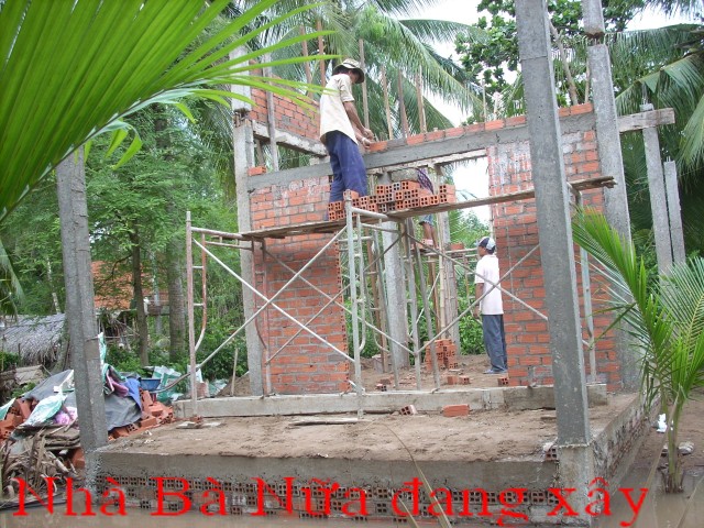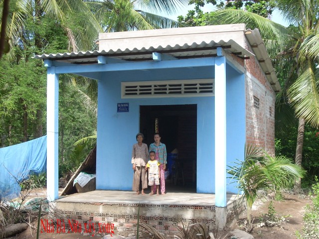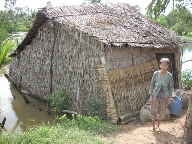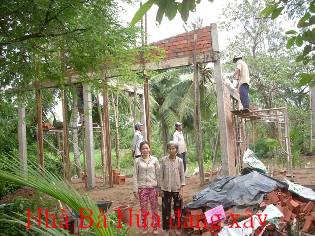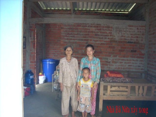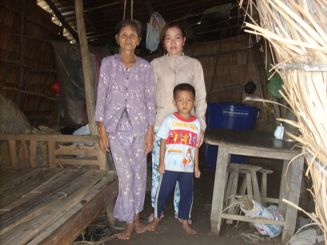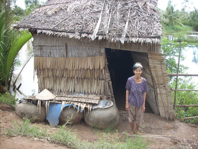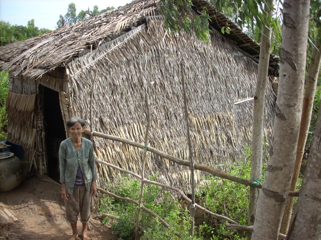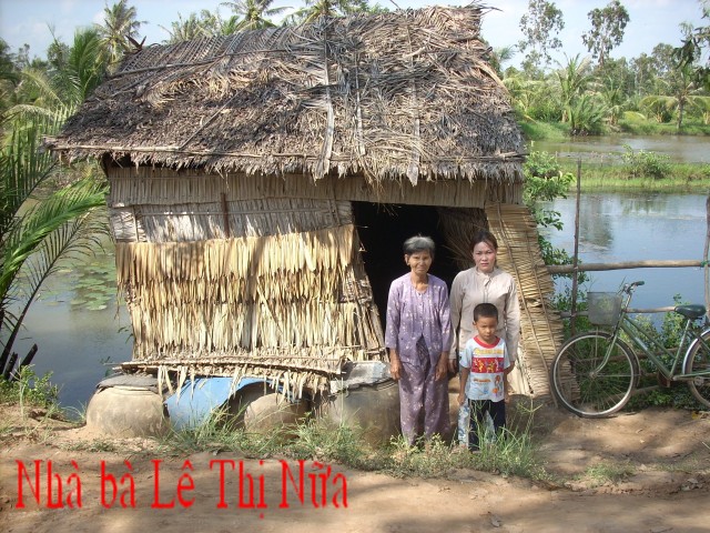 Mrs. Le Thi Nua, age 68, is residing at Thanh An Hamlet, Binh Thanh Village, Thanh Phu, Ben Tre. She has a son and a daughter. Her son has been lost for 15 years without any trace. Her daughter was married with a child of 4 year-old who is presently at kindergarten. She was then divorced and has moved in to live with her mother, working for hire, doing odds and ends, mostly hoeing up weeds for 2.5 dollars a day, but the work is seasonal so the income is not stable. Mrs. Nua herself picks wild, edible vegetable to sell for a mere 25 cents a day. She belongs to the Poor category and receives a monthly support of 9 dollars from the Government. Her house located on the water is tilting and can collapse to the waters, causing death to the family. As an act of compassion, her neighbors let her have a small piece of land to build a house of her own.
