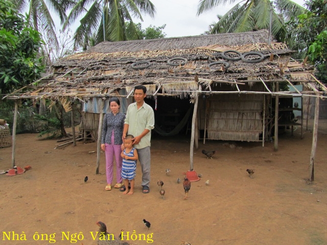Ngô Văn Hồng 29 tuổi, số nhà 137/2 ấp Thạnh Phước xã Thạnh Phong huyện Thạnh Phú. Có vợ, 1 con, lúc trước chồng đi làm thợ hồ, vợ ở nhà may đồ thuê, cuộc sống cũng tạm ổn. Cách đây gần 2 năm, ông Hồng bị thoái hóa cột sống lưng, hiện tại xách vật nặng khoãng 10 Kg không nổi, có lúc biến chứng phải nằm trên võng ăn cơm. Vợ ở nhà may để kiếm tiền mua gạo cho gia đình mỗi ngày được khoãng 3 đến 4 mươi nghìn đồng mà còn phải lo thuốc cho chồng nên cuộc sống rất khó khăn. Căn nhà đang ở đã bị dột nát, phải che mũ ở bên trong để mưa không dột. Cột nhà đã bị đứt chân mà không có tiền để cất lại.