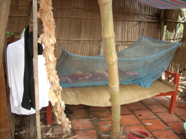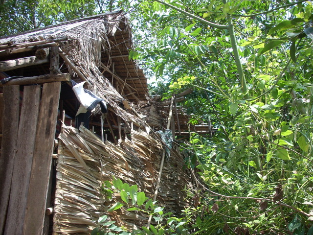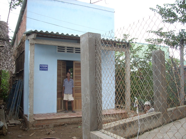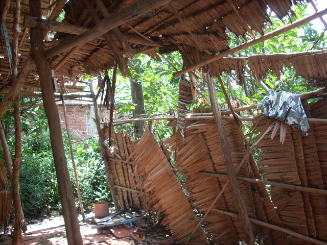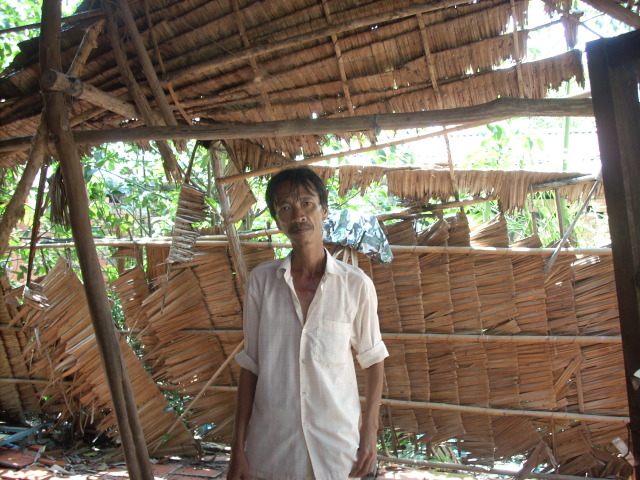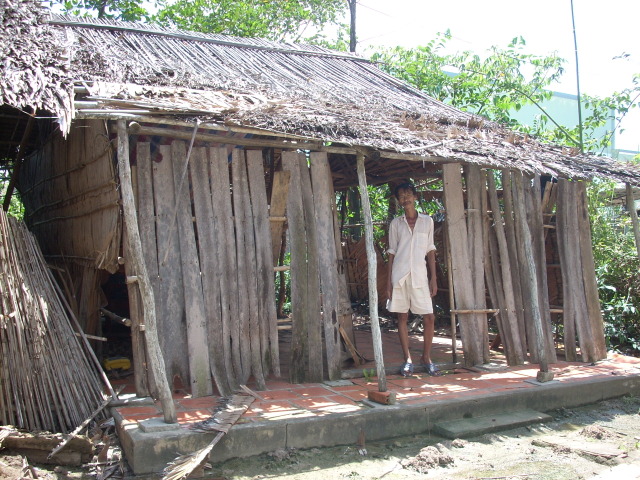 Mr. Thanh Nhan, age 46, is residing at Hamlet Thanh Loi, Binh Thanh village, Thanh Phu, Ben Tre. He has no family of his own and cannot do hard labor due to his weakness after the operation. His only earning comes from pulling a cart carrying goods for his sister and gets 1.50 dollars which is just enough to feed him for the day. His house is tilted then fastened and propped up with the help of the neighbors. The leaf-roof is in tatters and leaking and he has to use his leaf hat to cover part of his bed, the only property in the house. His parents and brother all died and his living condition is deplorable. He is hoping to get help to have a decent house to live in.