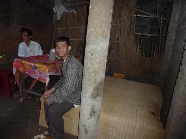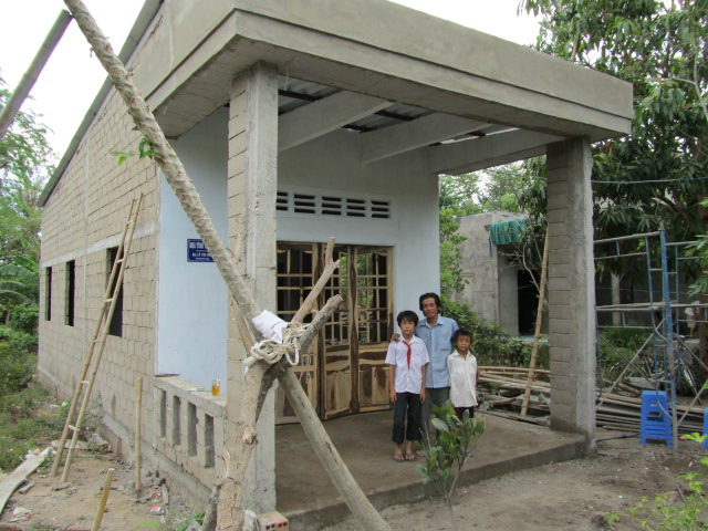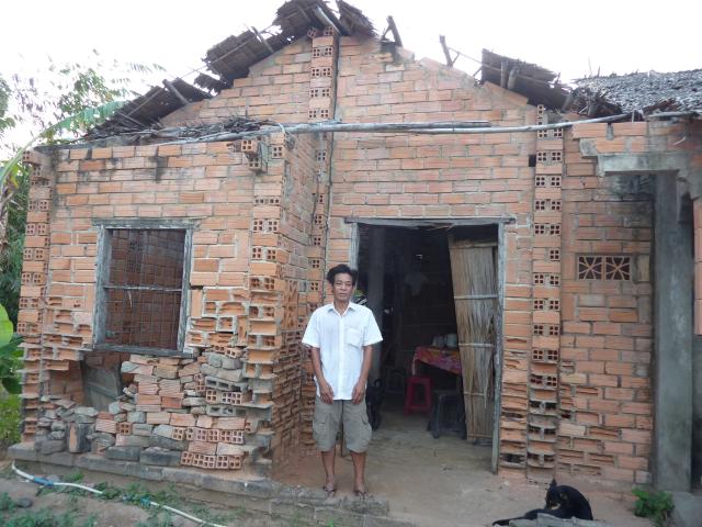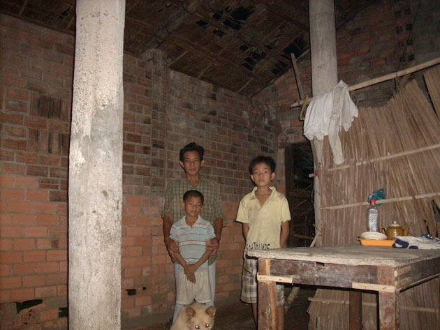 Nguyen Van Nhu: 43 years old, lives at 173/1 Thanh Quy A, village of Binh Thanh. He has 2 boys, ages 8 and 13. He farms on a small plot of land behind his home. Each day, he earns from 1 dollar to $1.50, not enough for the 3 of them. His hut has deteriorated, but he does not have any money to make any improvements. We have asked the government why they have not evaluated his situation to grant him a government assisted home; they replied that they have 5,000 cases to evaluate. This hut meets the qualifications, but they do not know when he will get his turn. We had visited this hut by chance to talk to his children because they were going to stop their schooling to try to earn money. Because of their situation, we had decided to grant them a home also.