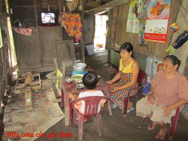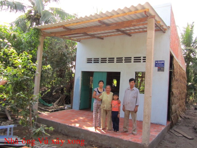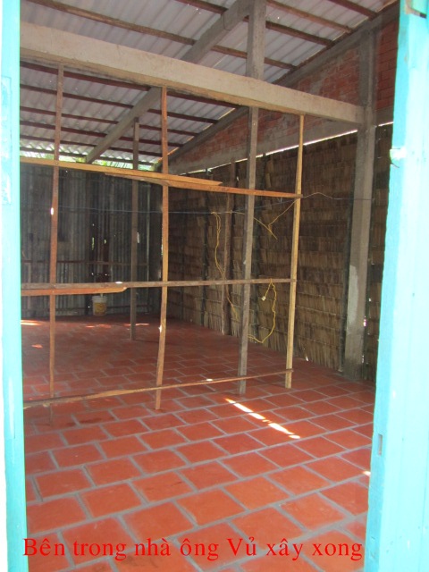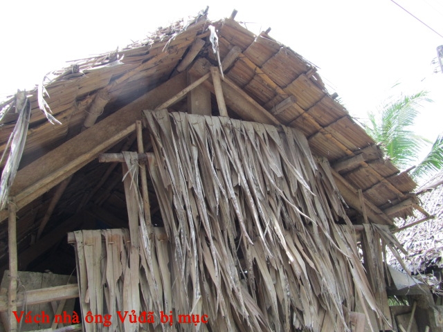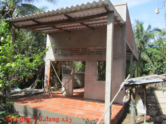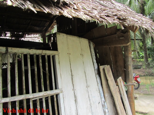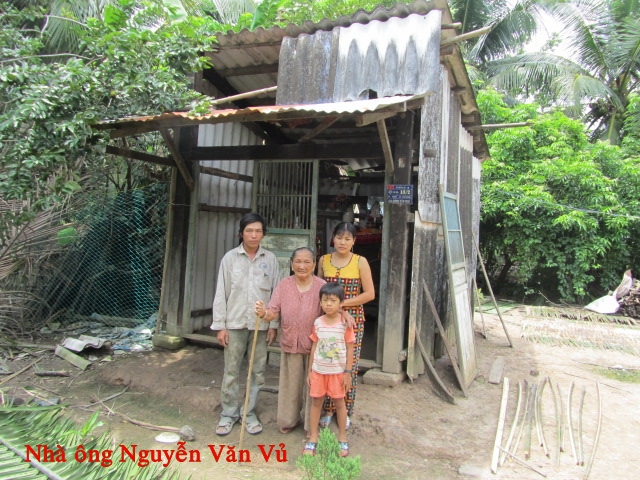 Ông Nguyễn Văn Vũ 40t số nhà 13/2 ấp Phủ xã Tân Phong huyện Thạnh Phú. Gia đình có 4 người: mẹ, vợ và 1 con nay 7t. Ông Vũ hàng ngày đi làm phụ hồ thu nhập khoảng 3 đô/ngày, vợ lãnh chỉ sơ dừa về se thu nhập chưa được 1 đô/ngày nhưng gia đình vẫn không ổn định. Căn nhà lúc trước bị sập không có tiền cất nên thu nhỏ lại để thờ ông bà. Hiện tại gia đình đang ở nhà dưới nhưng cũng bị dột nát. Căn nhà thờ ông bà đã bị mối ăn gãy, nhà lá đang ở cũng bị dột nát mà không có tiên xây lại. Gia đình rất sợ lúc trời mưa vì không biết nhà sẽ bị sâp lúc nào