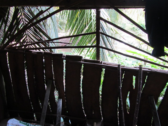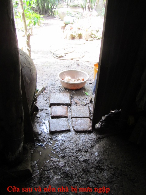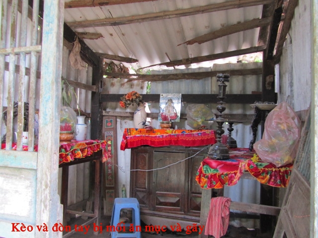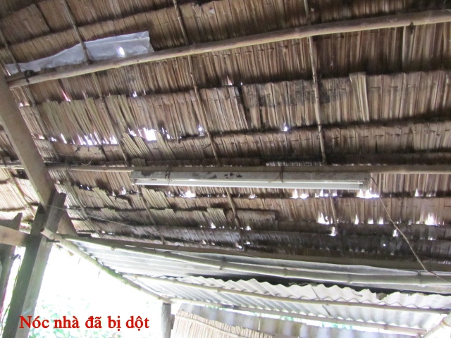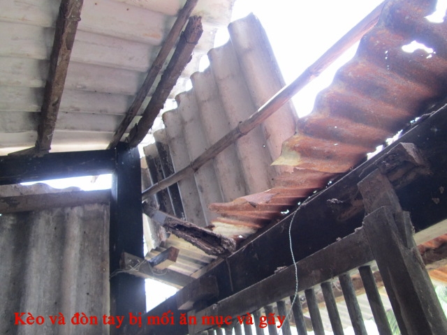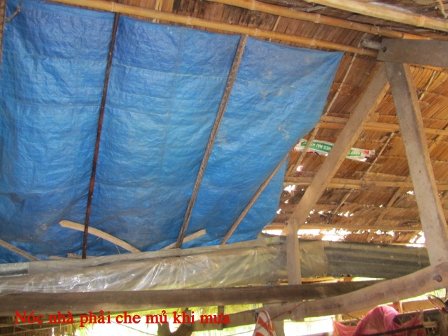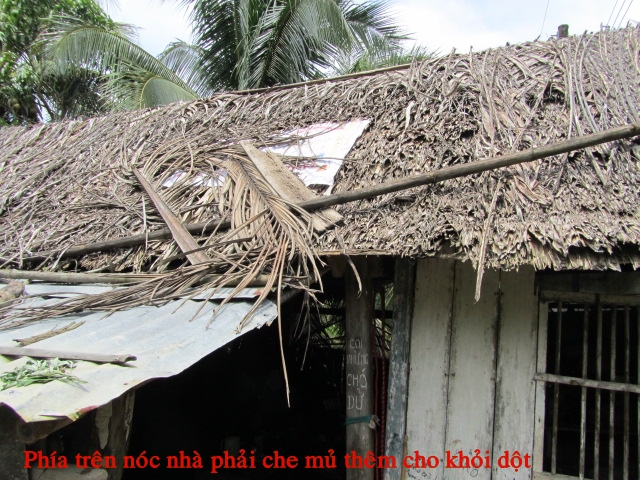 Mr. Nguyen Van Vu, age 40, is residing at 12/3 Phu Hamlet, Tan Phong Village, Thanh Phu. The family includes himself, his mother, his wife their 7-year-old child. He is working as assistant construction worker making around $3 a day while his wife spinning coco thread into cords, making around $1 a day, but that hardly meets the family needs. The house they used to live in collapsed and was repaired into a makeshift with the rotten upstairs space now used as an altar for the ancestors while the family live downstairs in tattered conditions, fearing that it can collapse any moment of rain or winds.