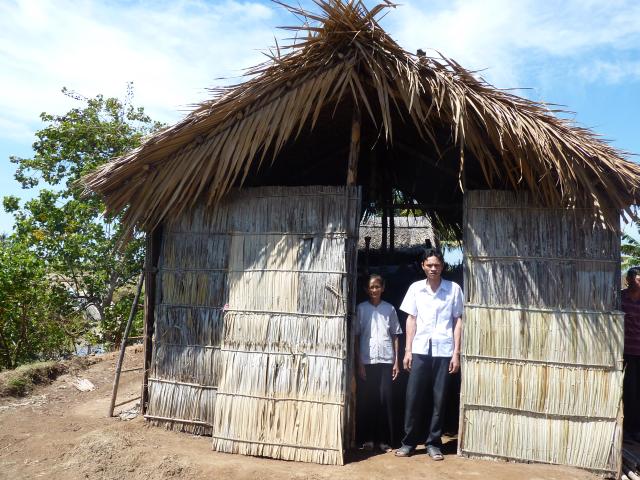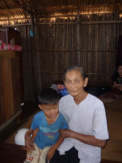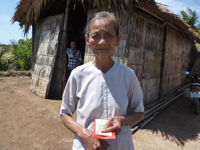 Tran Thi Bay: 69 years old. Lives at 19/1 Con Mit island, village of Thanh Phong. Is a widow, she lives with 1 child who is a helper to a cement worker. Sometimes he has work; sometimes he doesn’t. She is a servant to anyone who needs help. Her hut is rotted from the bottom up. Come the next flood, and her house will fall apart. We visited her on the eve of the New Year; we noticed her pots and pans were empty. We wanted to give her something to eat, but the dirt path to get to her house was difficult to travel – we were tired just from walking – so we could not bring her anything. We had to give her a small green oil bottle and some li xi money.