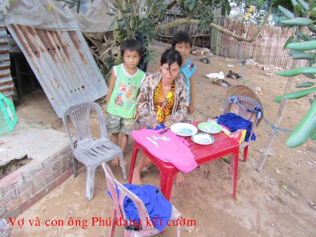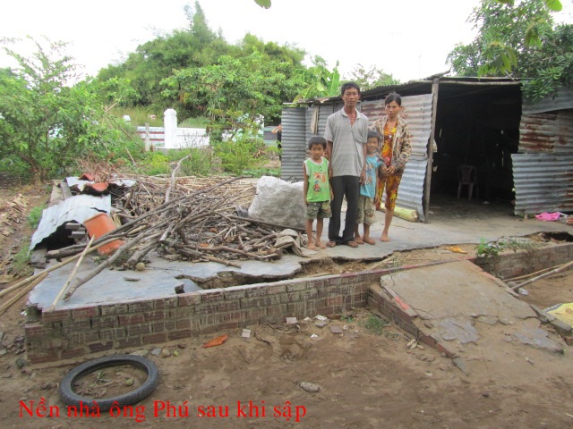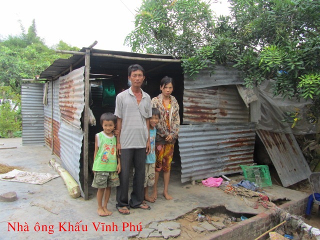 Ông Khấu Vĩnh Phú 38t. Chưa có số nhà ở ấp 5 xã An Thuận huyện Thạnh Phú. Gia đình có 4 người: vợ chồng và 2 con. Hàng ngày ông Phú ai thuê gì làm nấy, thu nhập bấp bên. Vợ ở nhà kết cườm (vải và hạt cườm của chủ đem lại, kết ăn công) mỗi ngày được 1 USD. Căn nhà bị gió sập nay hơn một năm, cho đến nay vẫn không có tiền cất lại. Hiện tại căn nhà đang ở được che bằng tol thiết của chòm xóm cho che cái sạp để gia đình ở đở. Lúc nhà sập người cha còn sống. Tổng cộng 5 người. Người cha chết nay khoảng 1 năm.