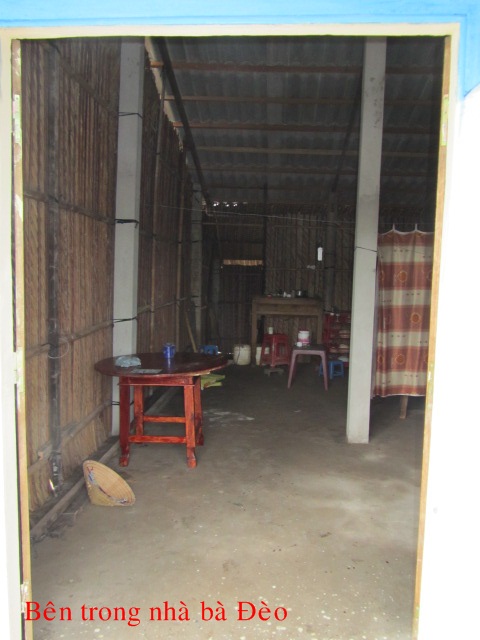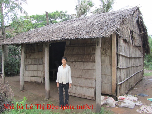 Lê Thị Đèo 50t ở số nhà 28/2 Cầu Ván xã Giao Thạnh huyện Thạnh Phú. Căn nhà lúc trước của cha mẹ để lại cho đến nay đã trên mười năm, nhà sắp sập nhưng không có tiền xây lại. Bà Đèo sống chung với cháu nhưng đi làm ở xa, không có trình độ nên làm cũng không có tiền. Ở nhà bà Đèo đi làm thuê, gánh đất mướn, hàng ngày thu nhập khoãng 2 đô nhưng không ổn định, vả lại bà bị tâm thần nhẹ nên cũng ít có người thuê