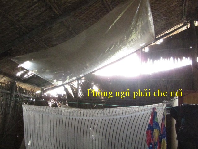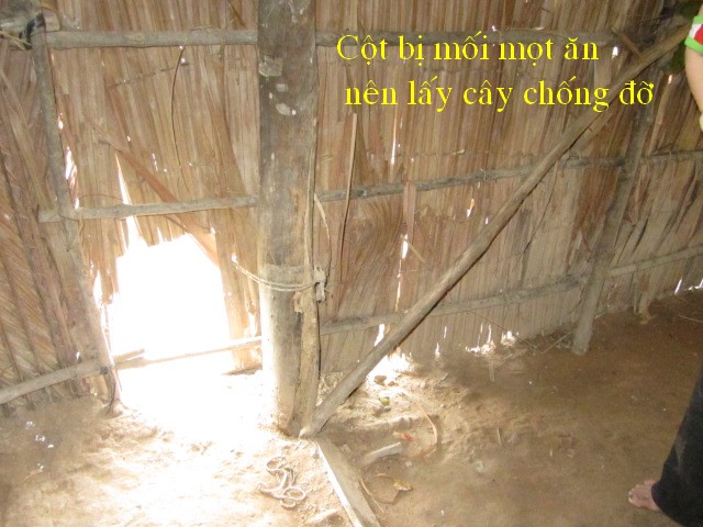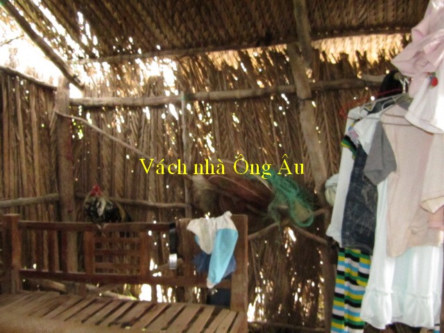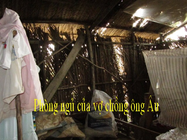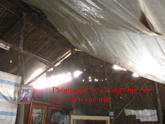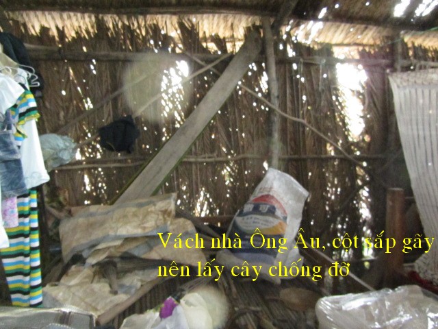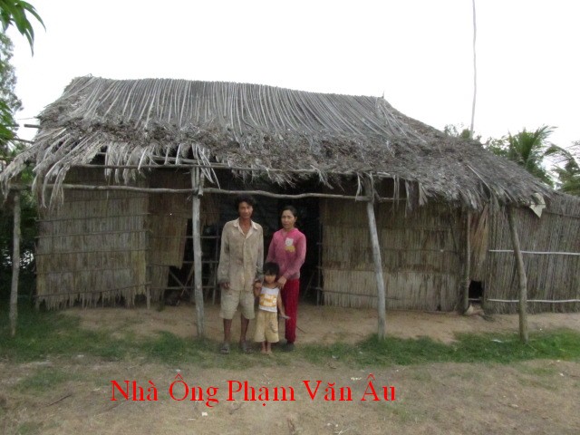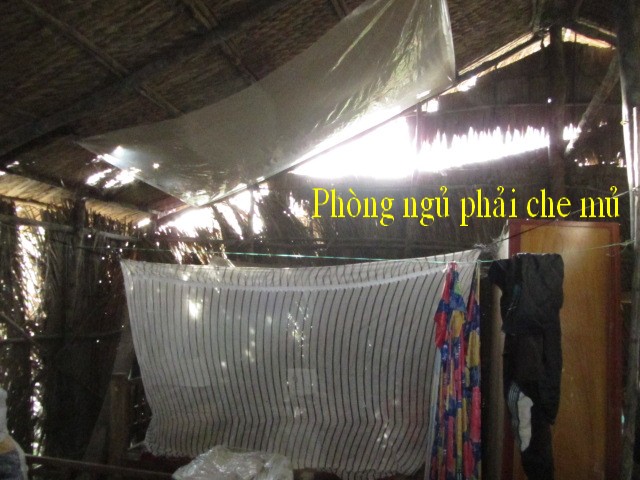 Mr. Pham van Au, age 39, and his wife Huynh Thi Dieu, age 37, have 2 sons, age 17 and 4. He has no land of his own, just the foundation of the house they are currently living in. He and his wife work for hire, doing trifling things like cutting and carrying sugar canes, making 4USD a day but it is unstable and usually their work lasts about 2 months. Off season, they move to Dac Nong, Dac Lac to pick coffee beans for about a month a year. His elder son quit school at age 15 to lay fish pot or cast net to catch fish to help with the family expenses. He works far away and won’t come home until 5 or 6 days. On season he makes around 10USD each trip. Mr. Au’s house is in bad conditions with rotten pillars and rafts. The roof is badly torn and he cannot afford to have it fixed. During rainy season, he has to use plastic to cover the leaky places in the house.