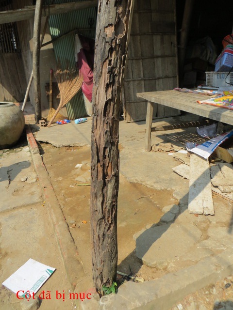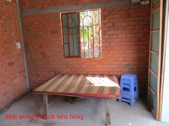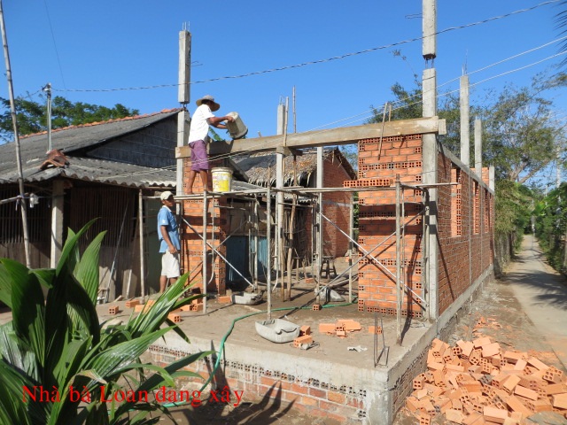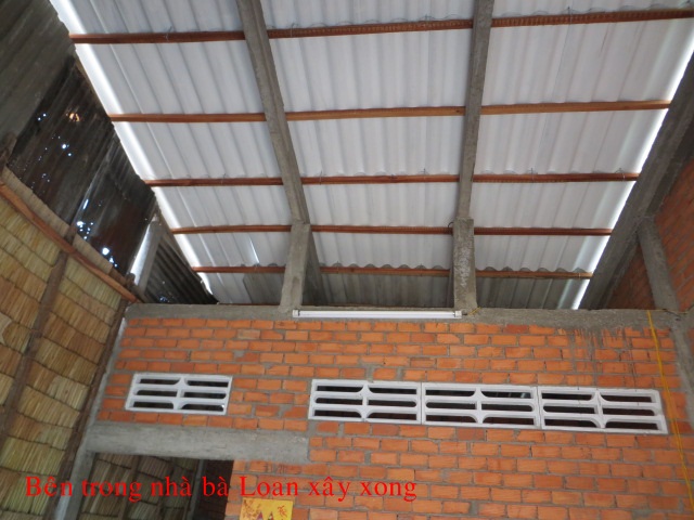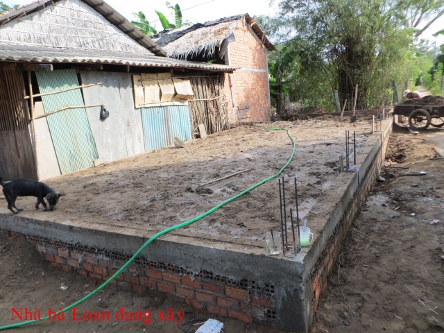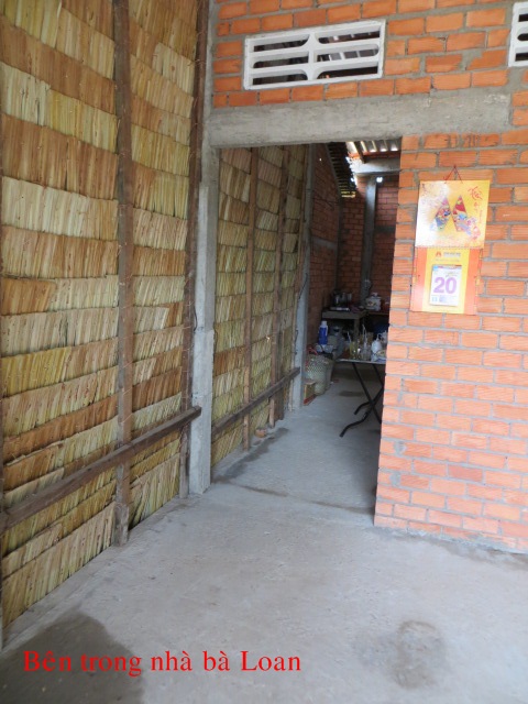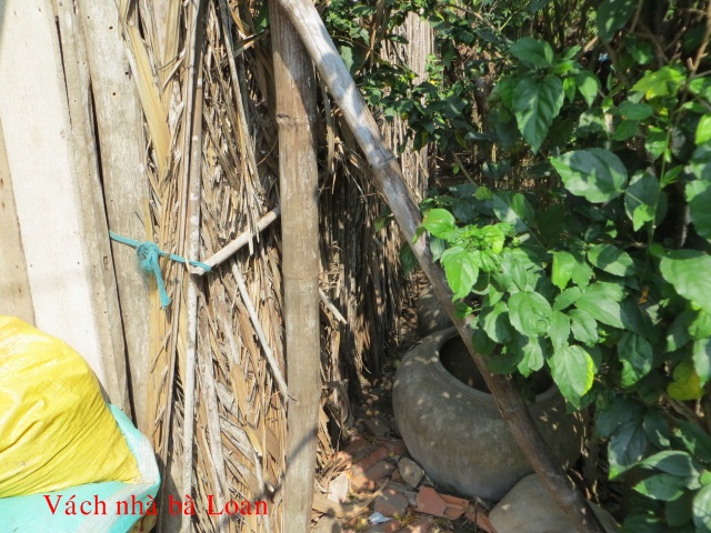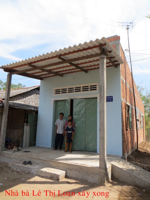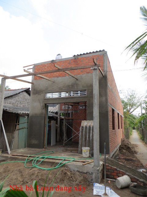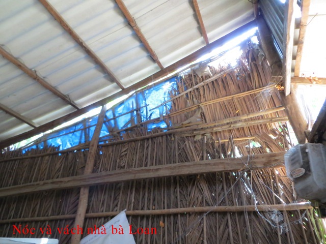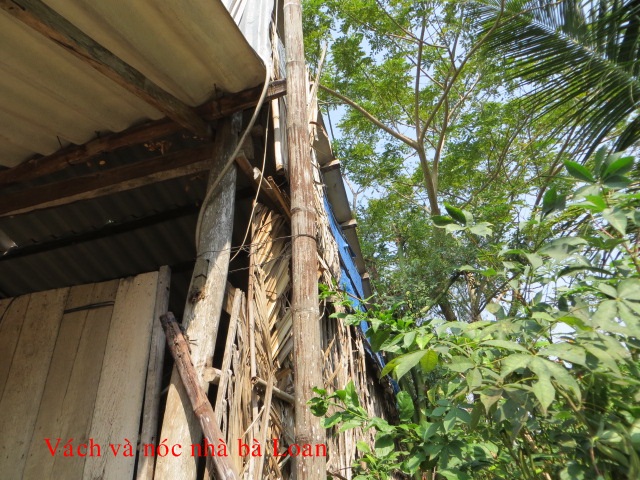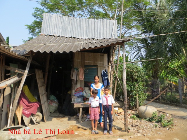 Mrs. Le Thi Loan, age 36, is residing in a house without number at Hamlet 5, Thanh Phu Village, Ben Tre Province with her husband and their 2 children. The husband is woking for hire, hoeing the land. Mrs. Loan makes her living by selling candies but it's not enough to feed the family. Her house was built 10 years ago and the sheet iron roof is still not paid off to the lender. The house is rotten and tilting to the side and would fall down had it not be for the 2 big trees that support it from that side. On rainy days with strong winds, the whole family have to stay at the neighbor's house for fear that the falling iron sheet fron the roof might crush on them.