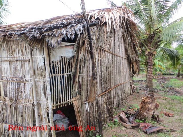 Nguyễn Tuấn An, 30t, ở ấp 6, xã Mỹ Hưng, huyện Thạnh phú. Gia đình có 4 người vợ và 2 con, không ruộng đất chỉ có 1 nền nhà đang ở. Hàng ngày ông An ai thuê gì thì làm nấy từ vác đất cuốc cỏ, gánh lúa thuê nhưng cũng chỉ đủ mua gạo ăn hàng ngày. Căn nhà được cất nay khoảng 6 năm bằng cây bạch đàn, hiện nay cột đã bị mục có thể sập bất cứ lúc nào nhưng chưa có tiền cất lại.
