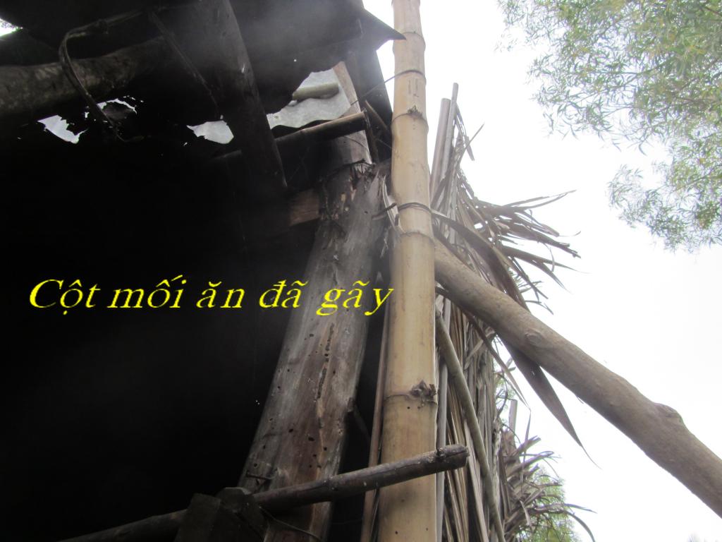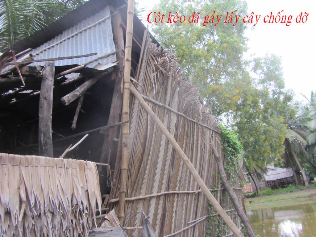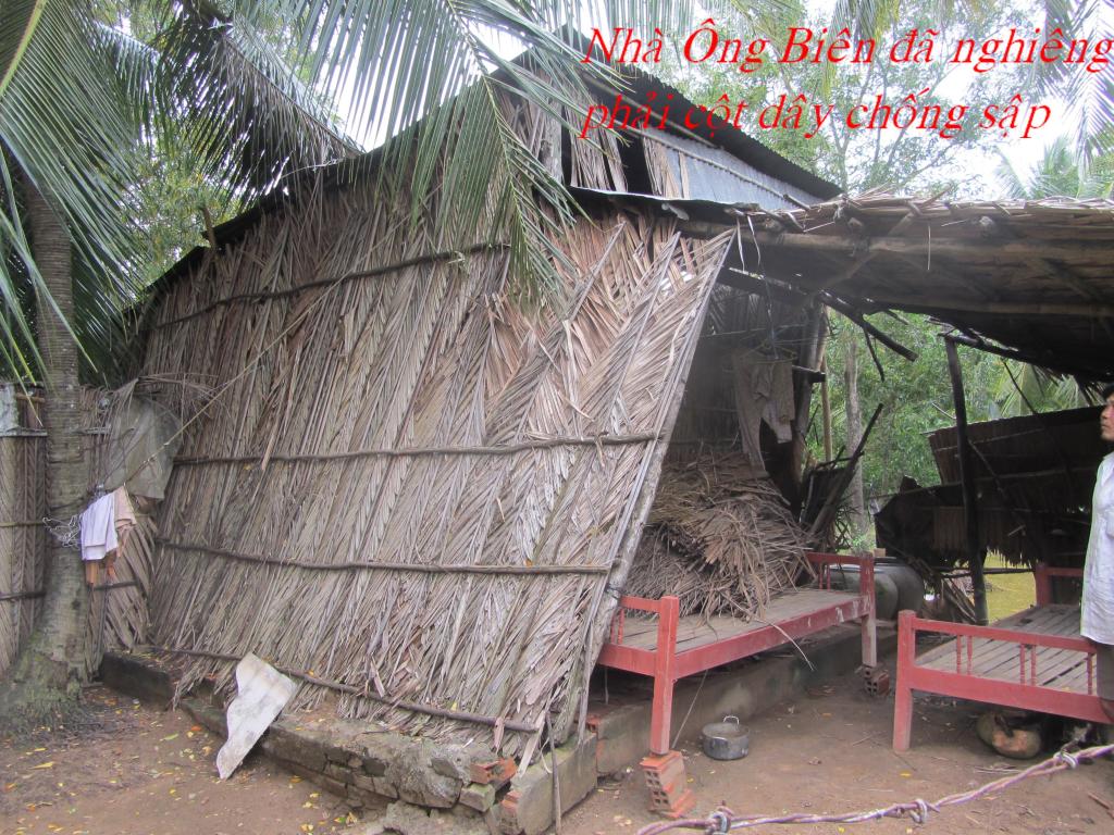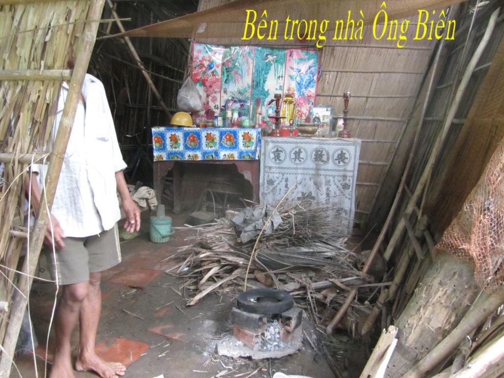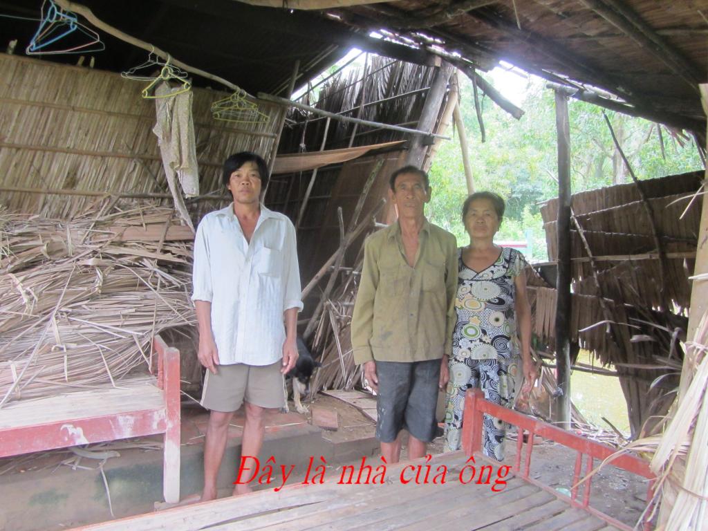 Mr. Vo Van Bien, age 66, is living with his wife Le Thi Ba, age 66 and his cousin Le Van Dinh, age 47 having light mental problems at 8/4 Thanh Tri Ha Hamlet, Thanh Phu Townlet, Thanh Phu District. His job is catching field crabs, making VND 15,000 a day while his wife weaves cords, making VND 10,000 and his cousin catches fish by net, making VND 25,000. The whole family makes around VND 50,000 (USD 2.5) on a good day, but these are not regular jobs. On non-working days they only have salt to eat with rice. Their house is on the verge of collapse with rotten collars and rafters and the ground is claimed back by the landlord. He was given a new ground to build a house but he cannot afford to do it.