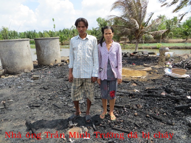 Ông Trần Minh Trường 34 tuổi ở ấp An Hòa xã Mỹ An huyện Thạnh Phú. Gia đình cỏ người: vợ và 1 con. Cách nay 1 ngày, căn nhà bị cháy hoàn toàn chỉ còn có bộ đồ mặt trong người. Nhà không ruộng đất,hàng ngày cả 2 vợ chồng đi bó chổi thuê cho chủ bản thân đã nghèo giờ lại càng nghèo thêm. Hiện tại bà con chòm xóm cho gạo, quần áo để mặc. Mùa mưa đã tới nên rất cần có căn nhà để ở.