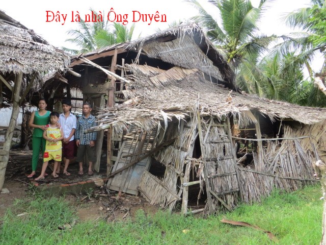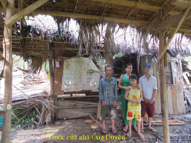 Mr. Tran Dien Duyen, age 39is living with his wife Nguyen Thi Duyen, age 34 at 179/1 Thanh Hoa A Hamlet. They have 2 sons Tran Dien Thanh, age 16 and Tran Dien Danh, age 12 who both quit school to help the family. Having no job training, they work for hire, making 300, 000 VND (15USD) a day, just to live on. Their house is on the verge of collapse but they have no means to fix it.