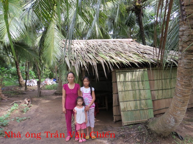 Ông Trần Văn Chiến 41t, vợ Nguyễn Thị Sang 38t ở ấp Xương Thới 3 xã Thới Thạnh huyện Thạnh Phú tỉnh Bến Tre. Gia đình có 5 người: vợ chồng và 3 con. Người chồng đi làm thuê, đứa con lớn đi học không nhà. Nhà không ruộngđất, chỉ có nền nhà ở. Ông Chiến đi giữ tôm thuê cho chủ ở Cồn Hươu. Căn nhà được cất nay hơn 9 năm. Cách nay 15 ngày căn nhà bị sập nên chòm xóm cho tre và lá cất lại để ở đỡ nhưng tre làm cột, lá dừng còn tươi xanh nên ở khoảng 1 năm thì bị mục chân cột và kèo,đòn tay bị mọt ăn. Vả lại căn nhà rất nhỏ, khi vào cửa phải khom người xuống nếu không bị đụng đầu.