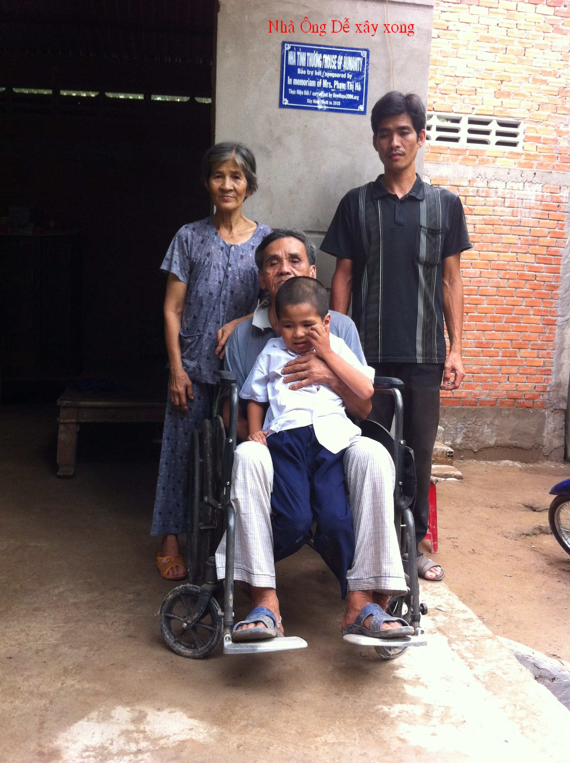 Mr. Tran Van De, 71 years old, and his wife, Nguyen Thi Kim Sa, 65 years old live in Hamlet 6, Hoa Loi, Giong Trom District, Ben Tre Province. He has a 35-year-old son who is married and has 2 children: a 4-year-old boy with autism and a new born. His son left home to go to work every day for a living, making 120,000 dong ($ 6) that can not feed 4 people. Mr. De is sick with complications and bound to a wheelchair so his wife, who does not have a job. takes care of him daily. Their neighbors help supporting them every monthl.