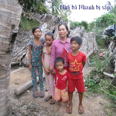 Bà Hồ Thị Nhanh, 36 tuổi. Chồng bà Ông Trần Văn Hồng, 38 tuổi. Có 4 con đều tuổi đi học, nhưng do nhà nghèo và nhà bị sập rồi mà không có tiền cất lại. Số nhà 8/1, ấp An Hội, xã An Thuận, huyện Thạnh Phú, tỉnh Bến Tre.