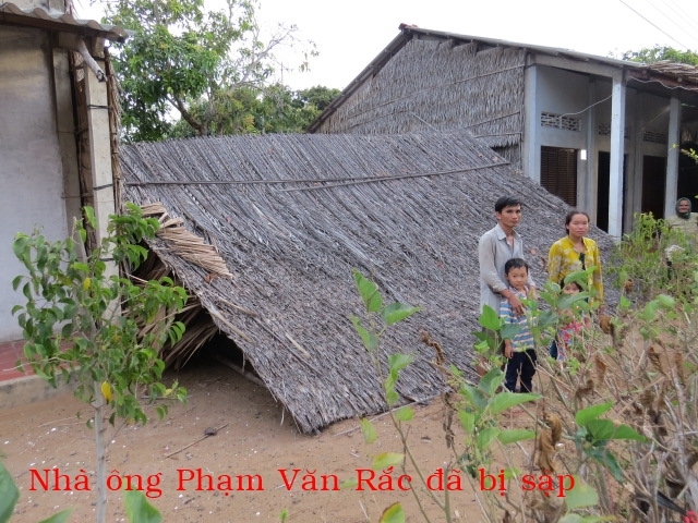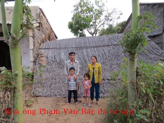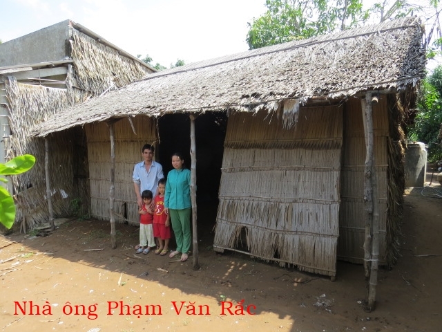 Phạm Văn Rắc 29t ở Xẻo Dưa xã Thạnh Hải huyện Thạnh Phú. Gia đình có 4 người: vợ chồng và 2 con. Hàng ngày vợ chông ông ai thuê gì thì làm nấy thu nhập chỉ đủ mua gạo. Căn nhà được cất nay hơn 5 năm hiện tại nóc nhà bị dột nát cột bị mụt xệ qua nhà kế bên và có thể sập bất cứ lúc nào. Khi trời mưa trong nhà củng như ngoài sân đều ướt hết. Nhà có thể sập nên gia đình không dám ở hiện tại cả nhà đi ở đậu nhà người quen
