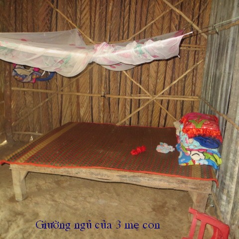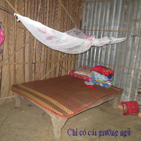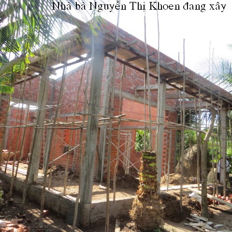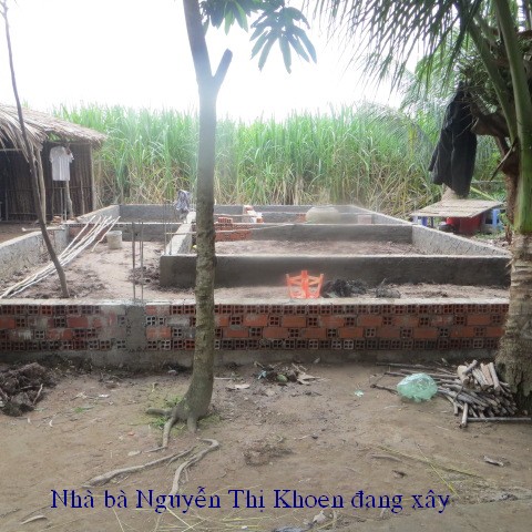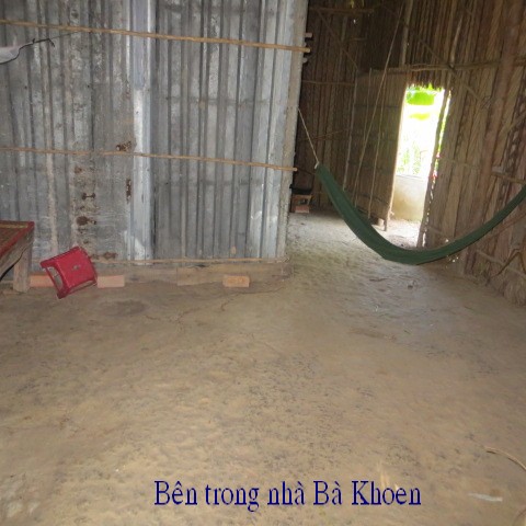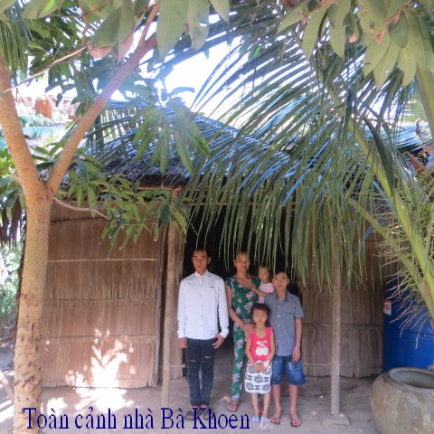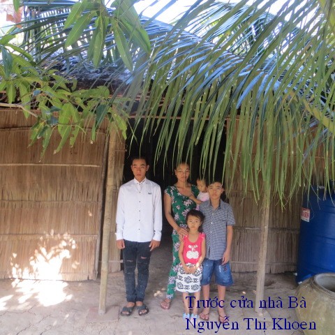 Nguyen Thi Khoen, 38 years old, resides at 57/3, Thanh An hamlet, Binh Thang village, Thanh Phu district, Ben Tre providence. Her husband left her and 4 children for another woman. Her eldest, Nguyen Van Be 17 years old, dropped out of school at 7th grade to work to help out the family and gives her $23/month. Her next son, Nguyen Nhat Thai, 14 years old, dropped out of school at 2nd grade, and working to care for 2 children. He gives her $47/month. Her daughter Nguyen Truc Linh is 5 years and can not go to school due to financial hardship. Her youngest Nguyen Thi Huynh Nhu is 2 years old. Because they are so poor, her family depends on her parents which are in their 80s for food. Her place has one 1 bed and 1 table with no chairs and needs to have a well.