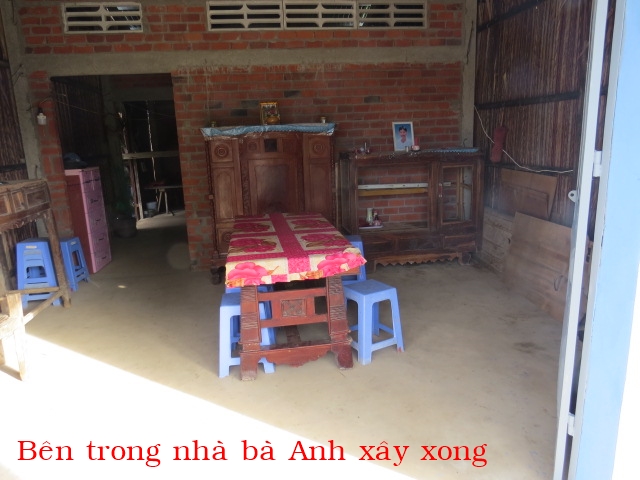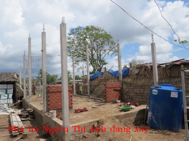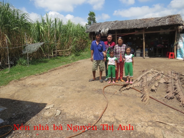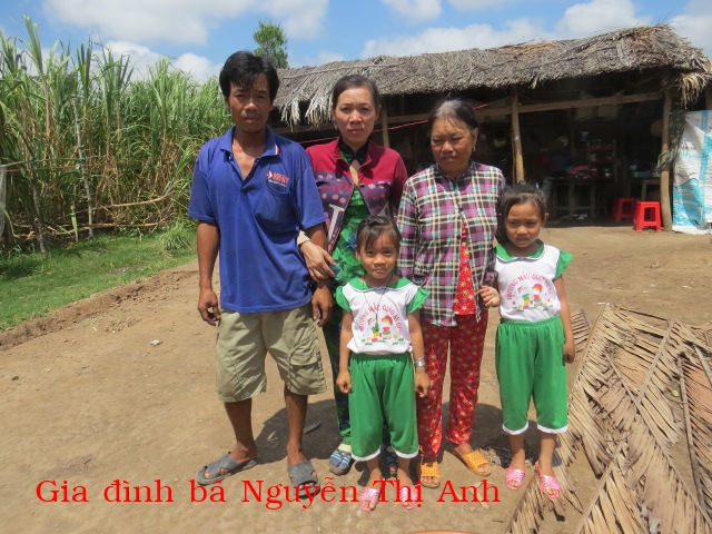 Bà Nguyễn Thị Anh 58t số nhà 139/2 ấp An Thủy xã An Qui huyện Thạnh Phú tỉnh Bến Tre. Gia đình bà có 5 người: bà 2 con và 2 cháu. Bà thì tuổi lớn bị đau nhứt, người con trai bị đau thần kinh tọa nên không làm nặng được chỉ có người con dâu hàng ngày ai thuê thì làm nấy, người con trai che cái chòi nhỏ để sửa xe đạp nói chung là hàng ngày thu nhập đủ mua gạo. Căn nhà củ được cất nay hơn 20 năm lúc chồng bà con song, hiện tại đã bị sập nên đã tháo dở nên gia đình dự tính thâu cây cột ngắn lại che thành cái nhà nhỏ ở đở khi nào có tiền thì cất lại. Lúc này chuẩn bị vào mùa mưa nên gia đình rất can nhà