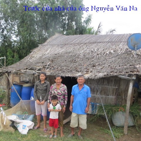 Ông Nguyễn Văn Na, 64 tuổi, vợ Bà Nguyễn Thị Loan, 62 tuổi. Số nhà 96/7, ấp An Hòa, xã Mỹ An, huyện Thạnh Phú, tỉnh Bến Tre. Ông Na và Bà Loan đang sống với con gái là Bà Nguyễn Thị Thiện, 36 tuổi và 3 cháu ngoại Nguyễn Thị Thủy Như, 14 tuổi học lớp 8 và Nguyễn Thanh Trung 6 tuổi học lớp 1 và chấu gái Nguyễn Thị Thanh Tâm, 10 tuổi học lớp 5, do em Thanh Tâm bị bệnh vải nến nên ngày chụp hình không có Bà Thiện và cháu Tâm ở nhà. Ông Na và Bà Thiện làm nghề bó chổi mướn chỉ đủ ăn qua ngày nên nhà dột thì không có khả năng cất lại.